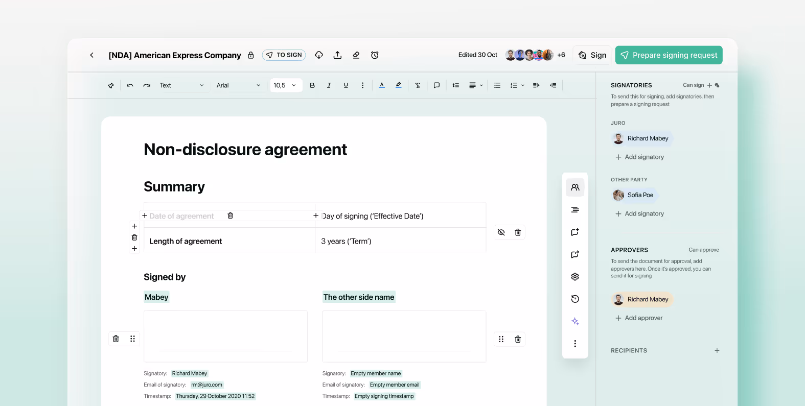 “Juro’s eSignature functionality has been a game-changer for us,” says Zak. “Instead of commuting to visit site managers in-person, we can simply send a signing request straight to their device and get it signed instantly. Plus, we have a detailed audit trail to ensure compliance and track the progress on these reviews” says Zak.