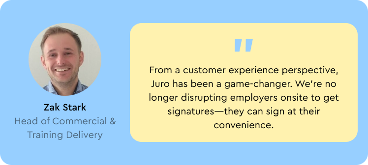 “From a customer experience perspective, Juro has been a game-changer. We’re no longer disrupting employers onsite to get signatures—they can sign at their convenience without losing time from their day. Employers find Juro extremely easy to use. They just open the email and sign there and then.”
