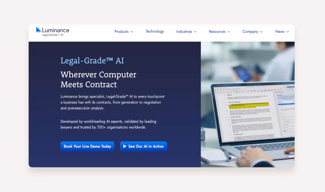 Luminance is an advanced AI-powered legal technology platform that transforms contract management through its proprietary Large Language Model. Developed by Cambridge mathematicians, it automates contract generation, analysis, and negotiation for over 700 organizations worldwide.